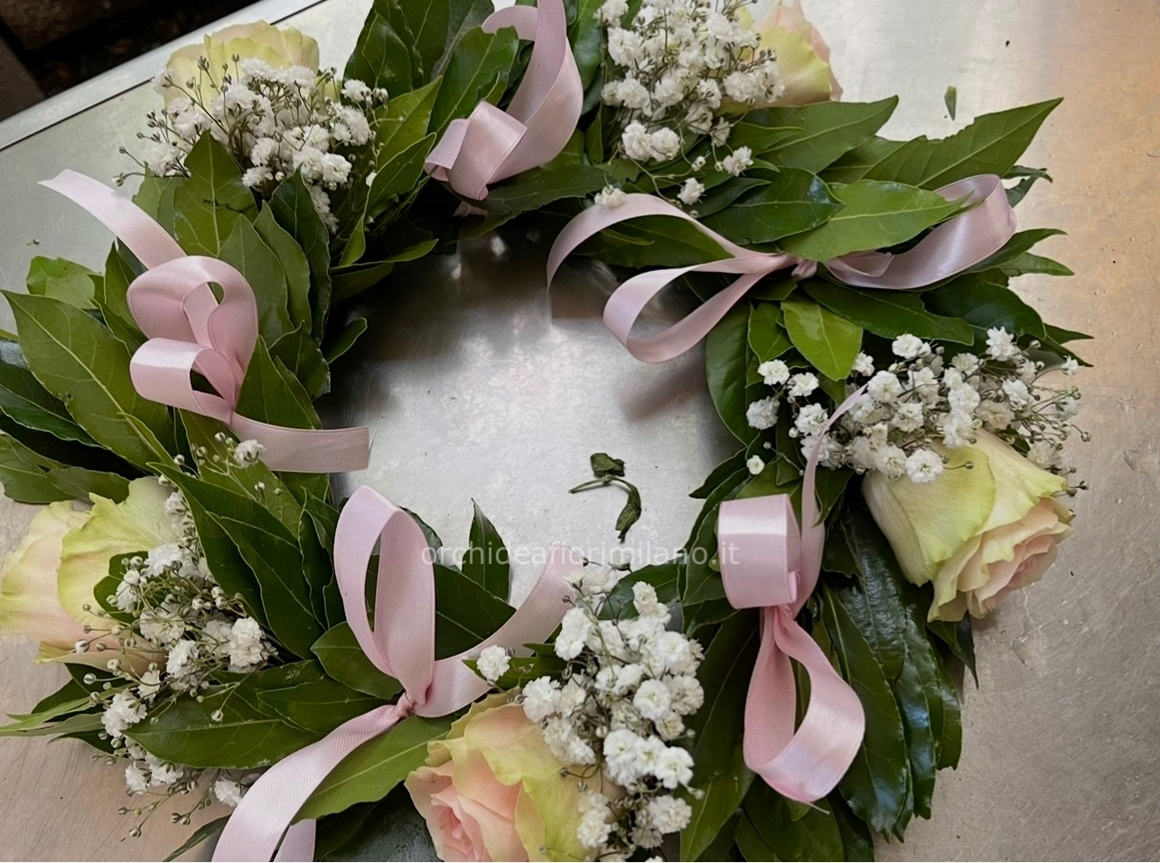 Coroncina di alloro con rose e gisofila Cod. 116531 | € 55,00 | Quantità : | |