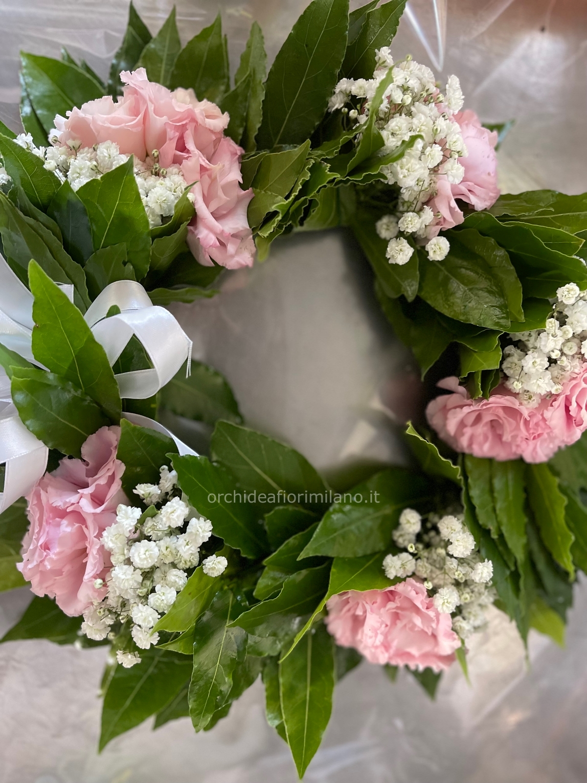 Coroncina di alloro lisianthus e gisofila Cod. 116530 | € 55,00 | Quantità : | |